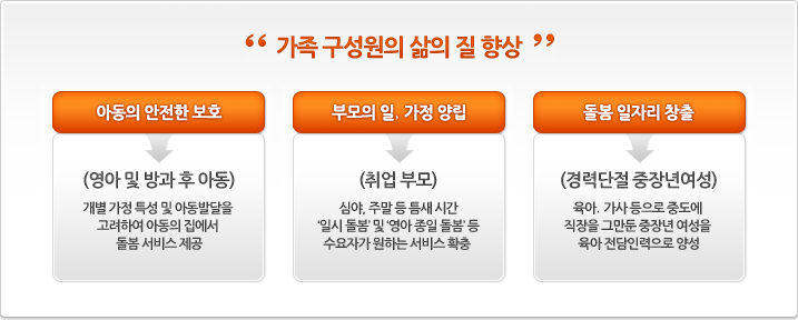 - 아동의 안전한 보호 : (영아 및 방과 후 아동) 개별 가정 특성 및 아동발달을 고려하여 아동의 집에서 돌봄 서비스 제공